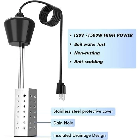 Le chauffe-eau à immersion haute puissance de 120 V et 1 500 W peut chauffer 5 gallons d’eau en quelques minutes (durée approximative : 5 gallons 1500W 40C 25-35 minutes de température. Plus d’eau nécessite plus de temps. 30 gallons 1500W 40°C 180-200 Minutes). Veuillez noter : les personnes ne peuvent pas être dans l’eau pendant que le chauffage fonctionne.