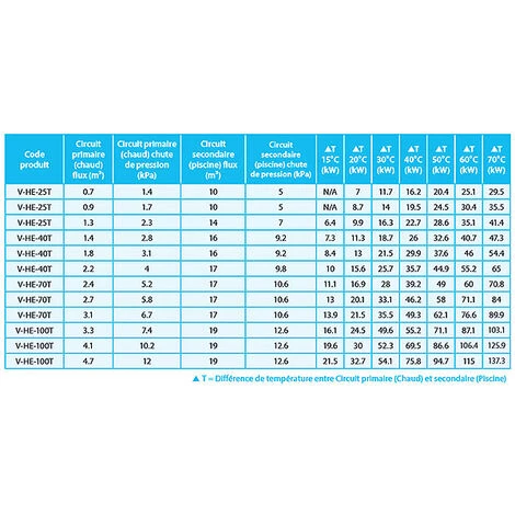 Débit de 0.7m³/h nécessaire au primaire (chauffage) et de 10m³/h au secondaire (piscine). Pertes de charge de 1.4 kPa au primaire (chauffage) et de 5 m³/h au secondaire (piscine).