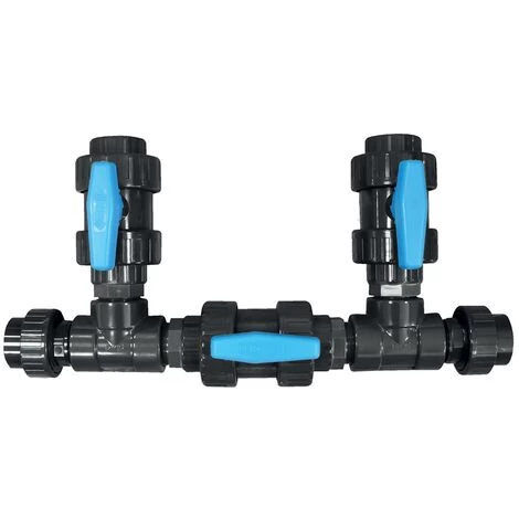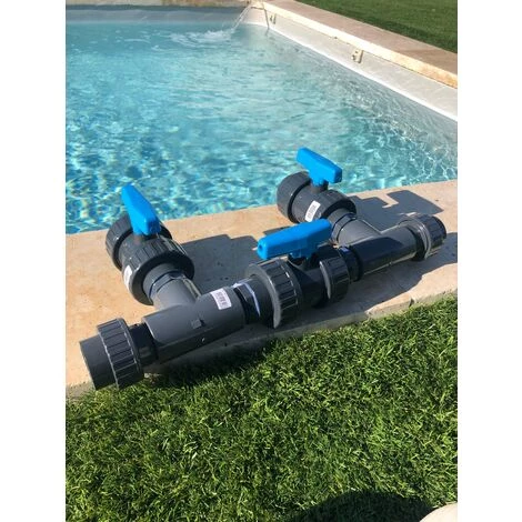 Composition du kit : – 2 Manchons à coller ext 50, taraudé 1’’1/2 – 2 Tés taraudés – 3 Vannes ¼ tour 50 – 4 Embouts filetés 40×1’’1/2 – 2 Rouleaux de téflon Montage : – Recouvrir les 6 filetages de ruban téflon en tournant dans le sens du vissage, maintenir le ruban tendu. (La marque du filetage doit presque disparaître). – Visser les différents raccords selon le croquis ci-dessous sur la partie by pass. Attention : Ne pas revenir en arrière car l’étanchéité ne serait plus assurée. Contrôler l’alignement avant de serrer à fond. – Coller les tuyaux rigides ou flexibles sur les entrées sorties de la pompe à chaleur et du kit by pass. S’utiliser aussi pour by pass d’electrolyseur au sel ou tout autre équipement