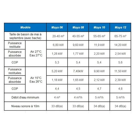 Si le modèle Maya est fait pour vous, il vous reste maintenant à déterminer la puissance adaptée à votre taille de bassin. Pour cela, consultez le tableau récapitulatif des caractéristiques techniques de chacun des modèles.
