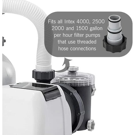 Compatible avec toutes les pompes de filtration Intex de 15 141,65, 9 463,53, 7 570,82 et 5 678,12 litres par heure qui utilisent des raccords pour un tuyau fileté.